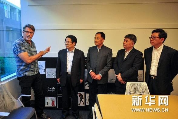 圖:7月1日,在美國伯班克市,入駐北京·洛杉磯文化創意產業園的一家動漫工作室負責人向到訪的中國文化部