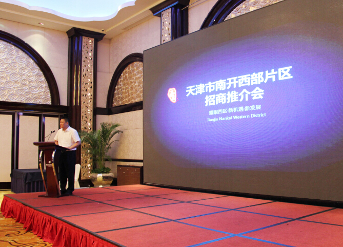會議開始后播放南開區情宣傳片,南開區政協副主席、西區管委會主任石江先生發表“產城融合,西部片區”主旨演講,介紹南開區招商環境。